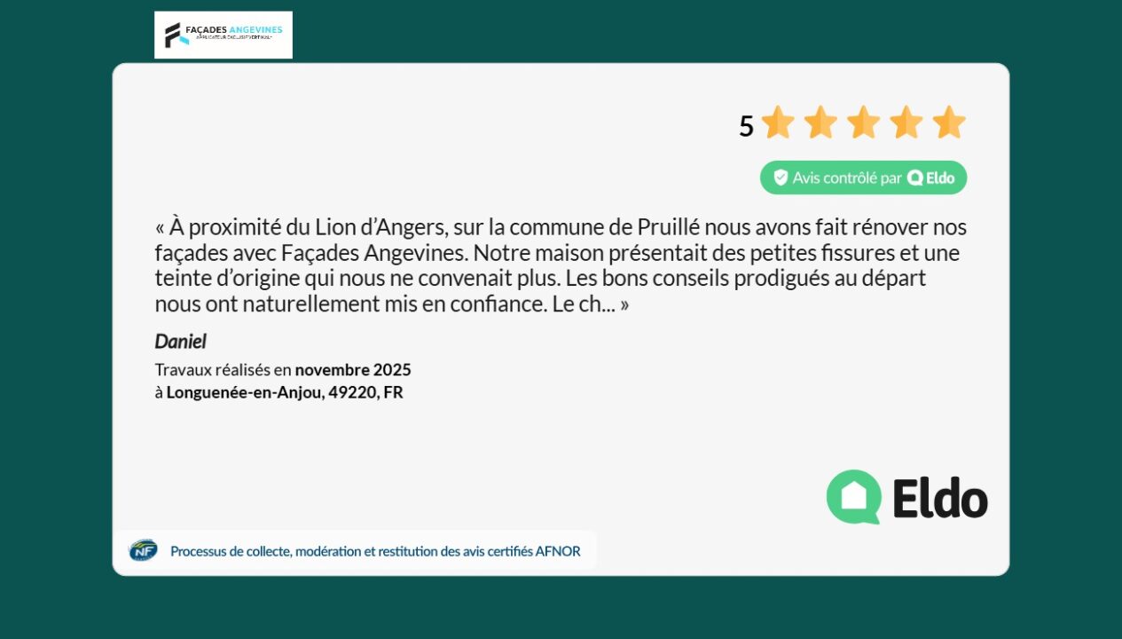 Apres consultation de plusieurs entreprises, ils ont rapidement retenu Façades Angevines pour l’approche, le sérieux, le savoir-faire, la qualité des produits présentés mais aussi et surtout pour son implantation locale. Les clients avaient également manifesté leur attachement à la propreté du chantier, ce qui a été respecter en tous points.