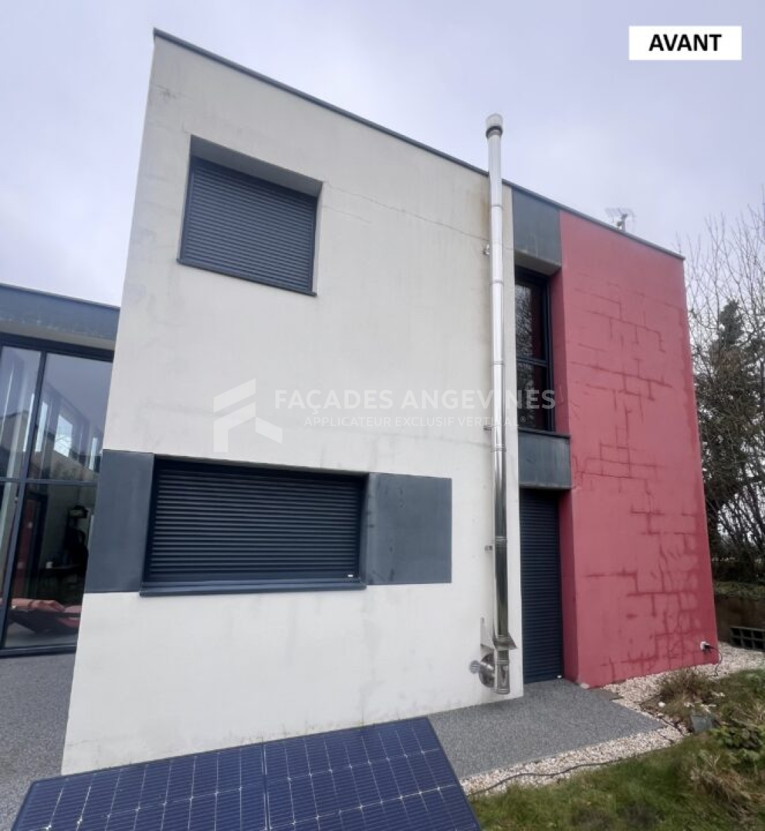 Après quelques années, les propriétaires de cette maison moderne relativement récente située à Longuenée-en-Anjou (49220), près du Lion d’Angers dans le département du Maine-et-Loire, se sont lassés de la couleur « originale » du garage et de la façade arrière. Ils avaient également constaté quelques zones de faïençage et de nombreuses microfissures provoquant ainsi un phénomène d’effet de mouillage des façades important.